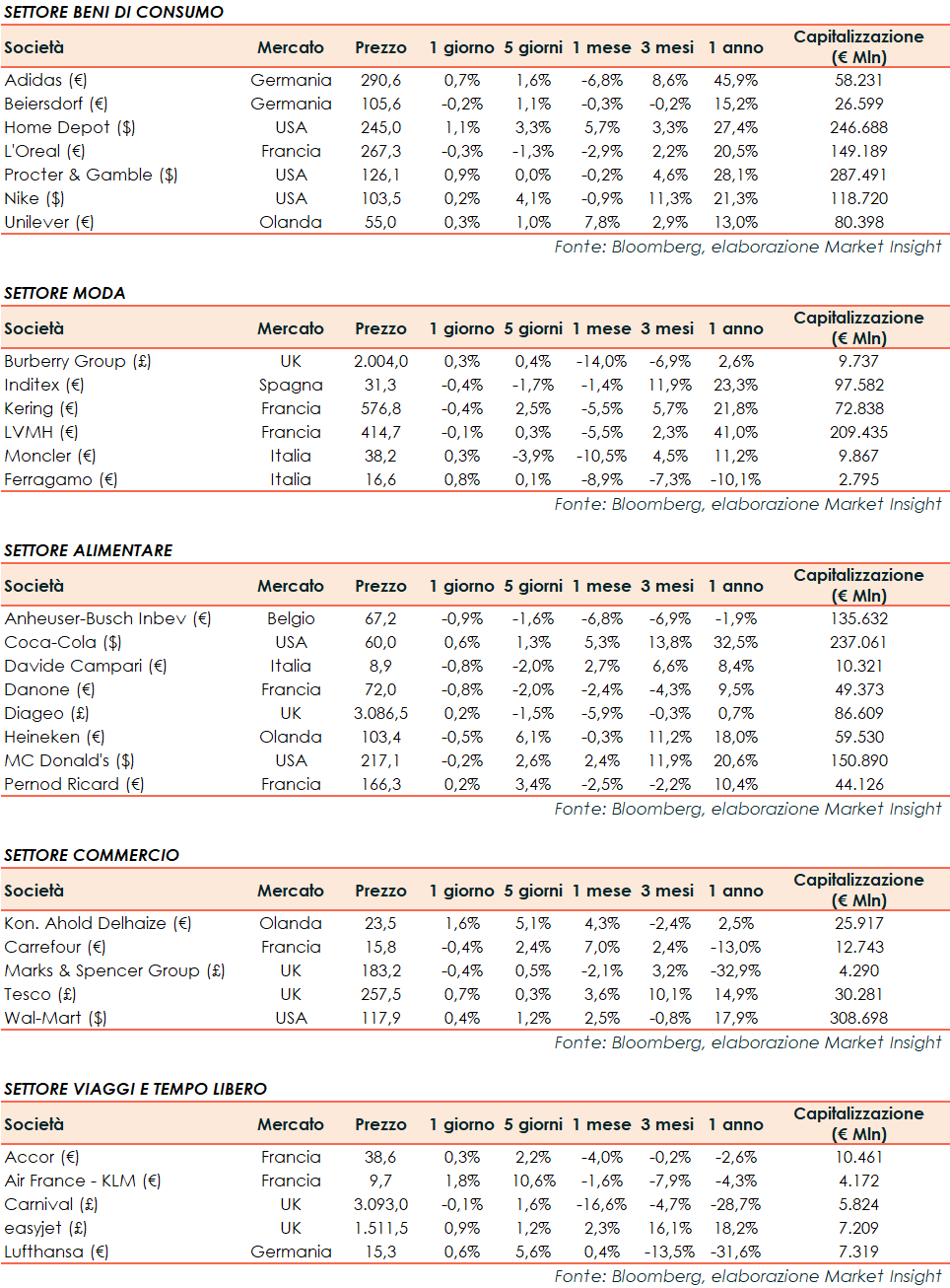 Si riporta l’andamento odierno dei principali titoli internazionali del settore relativo ai beni di consumo: