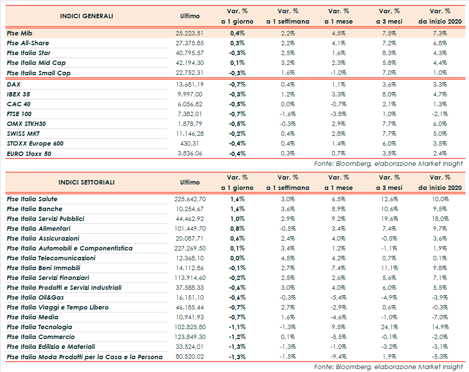Seduta debole per i principali listini del Vecchio Continente, ad eccezione del Ftse Mib di Milano che termina in rialzo dello 0,4% a 25.223 punti, sostenuto dal comparto bancario. In calo il Dax di Francoforte (-0,7%), il Ftse 100 di Londra (-0,7%) e il Cac 40 di Parigi (-0,5%), poco mosso l’Ibex 35 di Madrid (-0,3%).