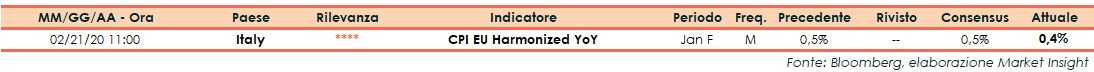 In Italia, nel mese di gennaio, l’indice armonizzato dei prezzi al consumo (IPCA) aumenta dello 0,4% su base annua, in lieve rallentamento rispetto al consensus e al mese precedente, entrambi a +0,5%.
