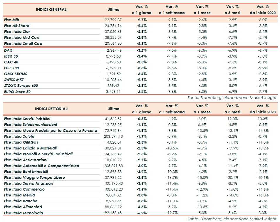 Il Ftse Mib chiude in ribasso del 2,7% a 22.799 punti, seguito dal Dax di Francoforte (-3,2%), il Cac 40 di Parigi (-3,3%), l’Ibex 35 di Madrid (-3,4%) e il Ftse 100 di Londra (-3,5%). Oltreoceano arretrano anche Dow Jones (-2,2%), S&P 500 (-2,1%) e Nasdaq (-2,4%), con Microsoft a -3,5% dopo essersi allineata ad altri colossi, tra cui Apple, nel mettere in guarda contro i possibili impatti del virus sulla propria supply chain.