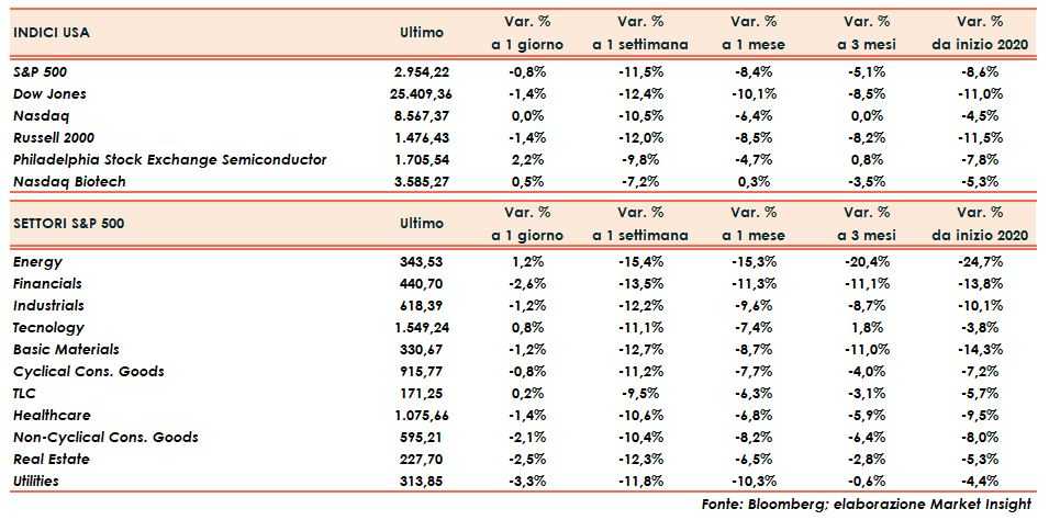 Il bilancio della settimana registra il Dow Jones in calo del 12%, lo S&P500 dell’11% ed il Nasdaq del -10,5%, tutti scesi in territorio di correzione.