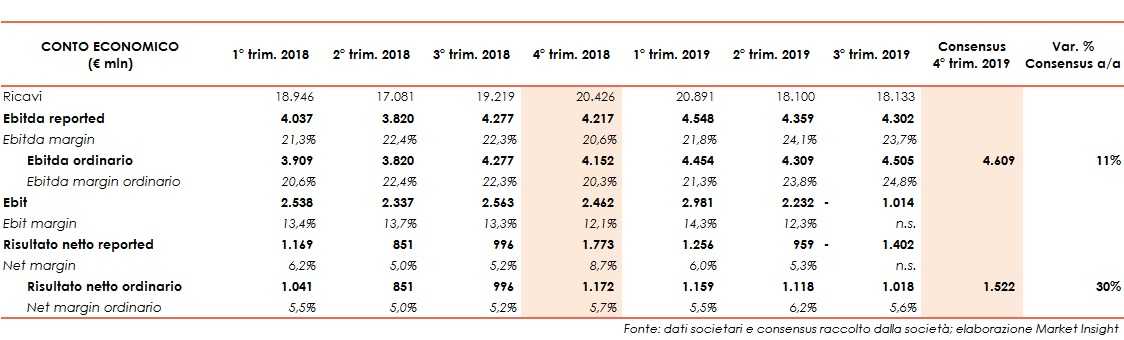 Nel dettaglio, sulla base delle stime degli esperti raccolte dalla società, l’Ebitda ordinario dovrebbe risultare pari a circa 4,6 miliardi, in crescita del 11% rispetto all’analogo periodo del 2018.