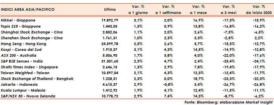 Seduta positiva anche in Giappone con il Nikkei a +3,1% e il Topix a +1,5%.