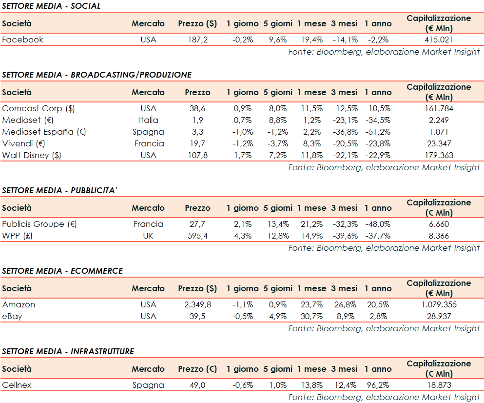 Si riporta l’andamento odierno dei principali titoli internazionali del settore dei media: