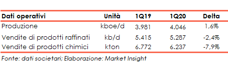 Nel periodo sono state prodotti, tra idrocarburi e gas, kboe 4.046 al giorno (kboe/d 3.981 nei primi tre mesi del 2019) e sono stati venduti 5.287 migliaia di barili di prodotti raffinati al giorno (kb/d 5.415 nell’analogo periodo del 2019), nonché 6.237 migliaia di tonnellate di prodotti chimici (6.772 migliaia nel primo trimestre del 2019).