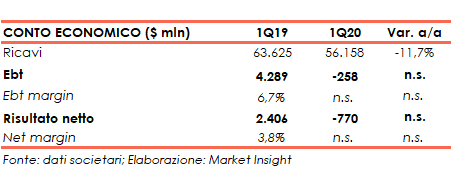 Nel primo trimestre del 2020 Exxon-Mobil ha registrato ricavi in calo dell’11,7% a/a da usd 63,6 miliardi a usd 56,2 miliardi.