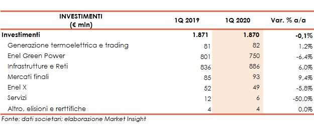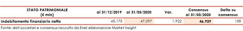 L’indebitamento finanziario netto cifra a 47.097 milioni, in aumento di 1.922 milioni rispetto a 45.175 milioni di fine anno 2019, principalmente per i maggiori investimenti di periodo e il pagamento di dividendi. Il dato è sostanzialmente in linea con la stima degli analisti (+158 milioni vs 46,9 miliardi).