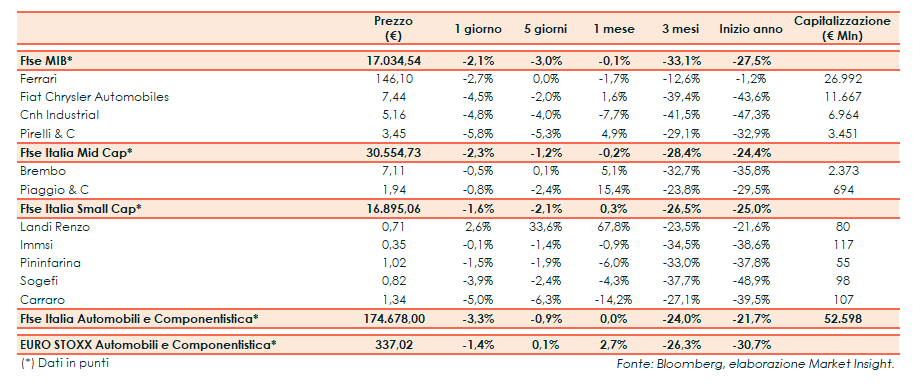 Il Ftse Italia Automobili e Componentistica ha segnato un -3,3%, rispetto al -1,4% del corrispondente indice europeo. Tra le big del comparto male Fca (-4,5%) dopo il crollo delle immatricolazioni in Europa registrato ad aprile.