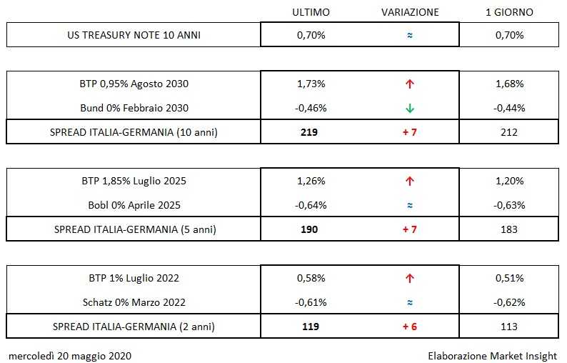 Al momento il Btp con scadenza agosto 2030 rende il 1,73% (+5 bp), separato da un differenziale verso Bund allargatosi di 7 punti base a 219 bp.