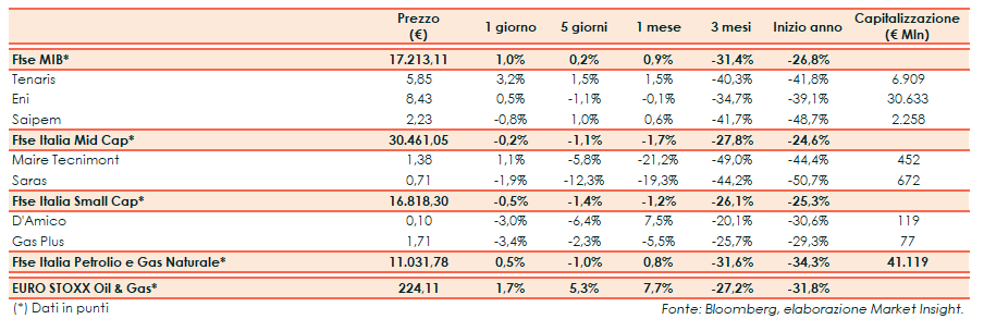 A Milano il Ftse Mib ha terminato la seduta con un +1% a 17.213 punti. Il Ftse Italia Petrolio e Gas Naturale ha segnato un +0,5%, rispetto al +1,7% del corrispondente indice europeo.