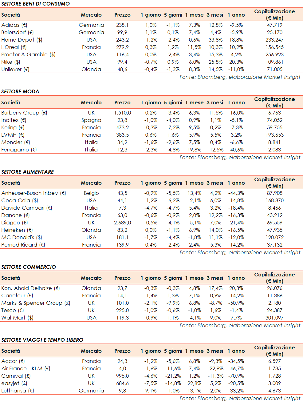 Si riporta l’andamento odierno dei principali titoli internazionali del settore relativo ai beni di consumo: