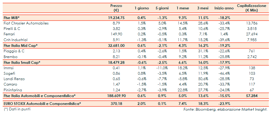 A Milano il Ftse Mib ha terminato le contrattazioni con un +0,4% a 19.234 punti. Il Ftse Italia Automobili e Componentistica ha segnato un +0,6%, rispetto al +2% del corrispondente indice europeo.