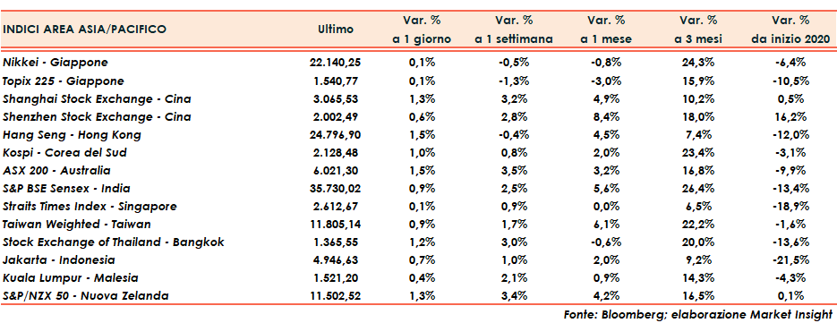 Tornando ai listini asiatici in Cina Shanghai guadagna l’1,3% e Shenzen lo 0,6%. Forte rimbalzo, nonostante le tensioni politiche, per Hong Kong che guadagna l’1,5%.