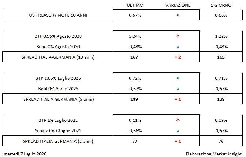 Sul fronte dell’agenda macroeconomica, la produzione industriale tedesca ha segnato su base mensile un rialzo del 7,8% a maggio, dopo il -17,9% di aprile, deludendo tuttavia gli analisti che si attendevano un +11,1%. Hanno, invece superando ampiamente il consensus (+15%) le vendite al dettaglio in Italia che a maggio sono balzate del 24,3% su base mensile dopo il -10,7% di aprile.