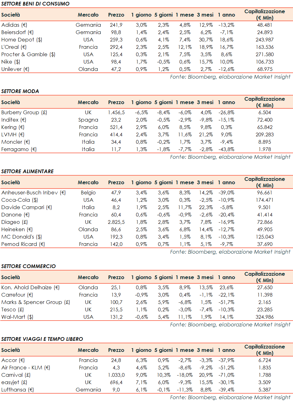 Si riporta l’andamento odierno dei principali titoli internazionali del settore relativo ai beni di consumo: