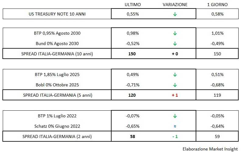 Dall’agenda macro è emerso che nel 2Q 2020 il Pil destagionalizzato preliminare della Germania è precipitato su base trimestrale del 10,1%, oltre quanto stimato dagli analisti (-9%), mentre sul fronte occupazionale, a luglio il tasso di disoccupazione corretto degli effetti stagionali è rimasto invariato rispetto a giugno al 6,4%, attestandosi al di sotto del consensus (6,5%).