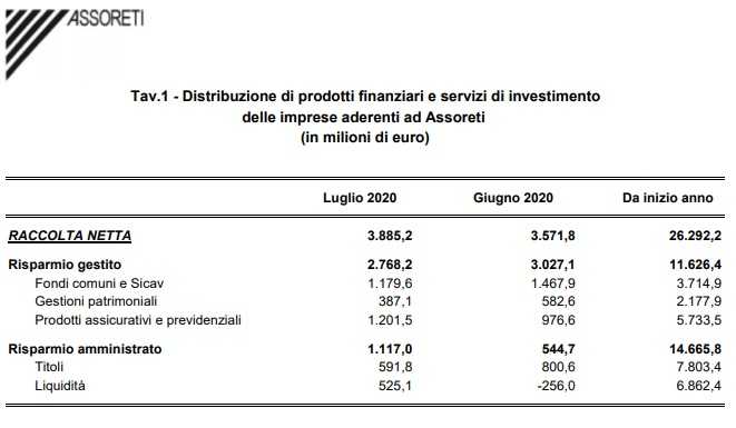 Le reti di consulenti finanziari abilitati all’offerta fuori sede, a luglio, hanno registrato una raccolta netta positiva per 3,9 miliardi (+8,8% m/m e +28,6% a/a). È quanto riportano le statistiche diffuse da Assoreti.