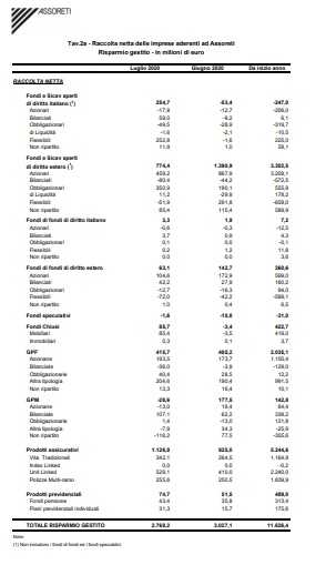 Positivo per 387 milioni (-33,6% rispetto a giugno 2020) la raccolta netta relativa alle gestioni patrimoniali individuali (GPF +2,6% m/m a 416 milioni; GPM evidenziano riscatti netti per 29 milioni), mentre la raccolta netta realizzata sui prodotti assicurativi e previdenziali registra sottoscrizioni nette per 1,2 miliardi (+23% m/m e +27,2% a/a), grazie soprattutto ai premi netti versati sulle unit linked (+529,1 milioni, +29% m/m), sulle polizze multi-ramo (+256 milioni) e sulle polizze vita tradizionali (+342,1 milioni,29,3% m/m).