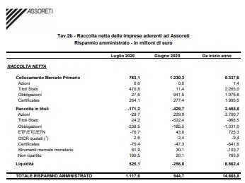 La raccolta netta sui titoli in regime amministrato è positiva per 592 milioni (-26% m/m). Le movimentazioni realizzate nel mese su titoli di Stato (+471 milioni) e certificates (+264 milioni) segnano la prevalenza degli ordinativi di acquisto rispetto alle vendite. La liquidità ha registrato afflussi netti per 525,1 milioni (-256 milioni a giugno 2020).