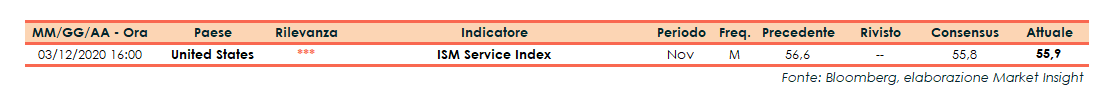 A novembre l’indice ISM servizi degli Stati Uniti ha registrato un valore di 55,9 punti, lievemente al di sopra delle aspettative degli analisti (55,8 punti) ma in calo rispetto alla rilevazione di ottobre (56,6 punti).