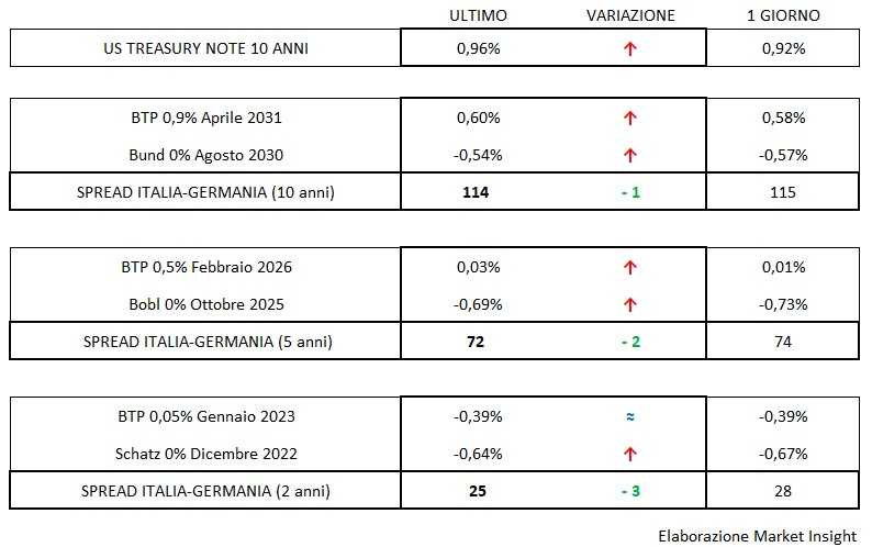 Tornando all’obbligazionario il rendimento del Btp sale leggermente allo 0,6% (+2bp) con uno spread a 114 punti (-1 bp).