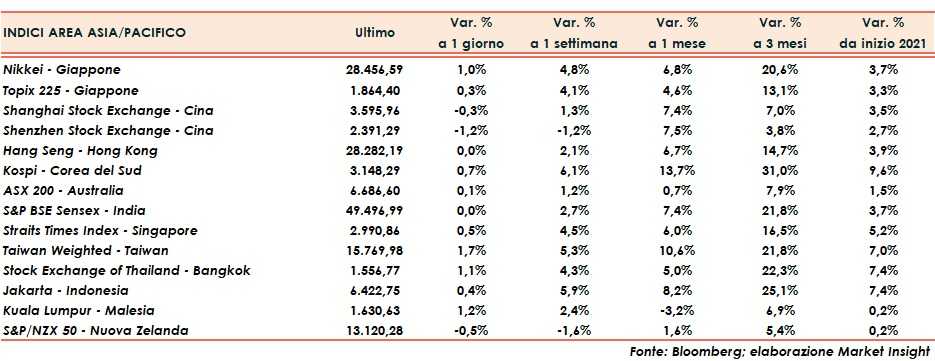 Le principali piazze asiatiche si sono mosse senza una direzione precisa mentre gli investitori continuano a monitorare l’evoluzione della pandemia e le dinamiche USA, dove la prospettiva di un maggiore sostegno fiscale negli Stati Uniti continua ad alimentare le aspettative di una ripresa economica.