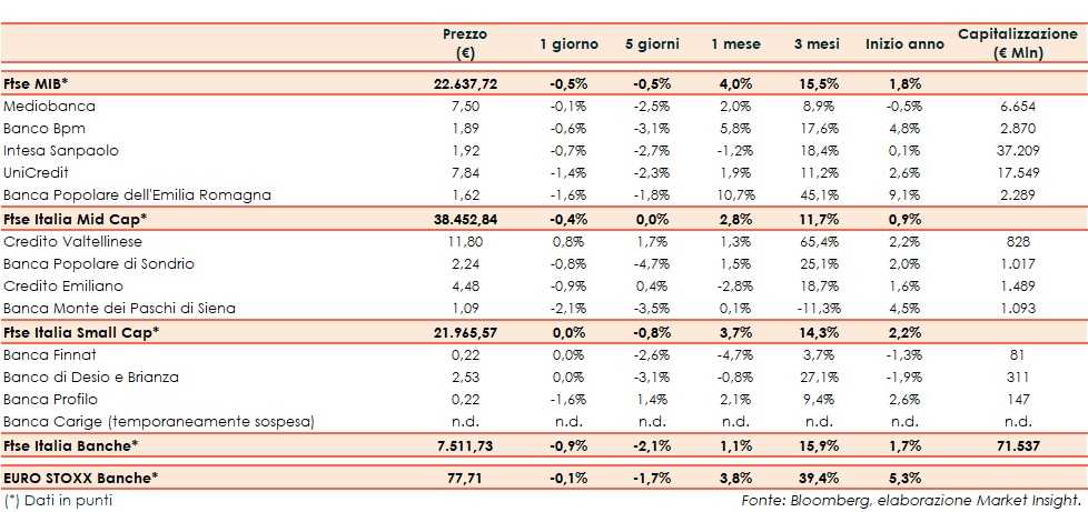 Il Ftse Italia Banche chiude con un calo dello 0,9% e al di sotto dell’analogo indice europeo (-0,1%), frenando anche il Ftse Mib (-0,5%).