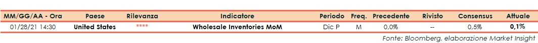 A dicembre il dato preliminare diffuso dal Dipartimento del Commercio sulle scorte all’ingrosso statunitensi ha evidenziato un aumento dello 0,1%, deludendo le attese (+0,5%) dopo la variazione nulla di novembre.