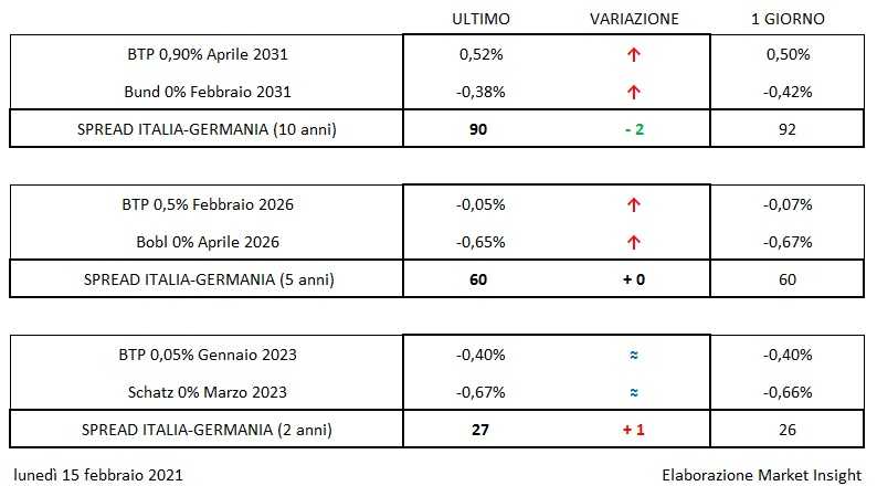 Sul mercato dei titoli a reddito fisso, il Btp decennale sale allo 0,52% (+2 bp) con uno spread in calo tuttavia a 90 punti (-2 bp), in virtù dell’andamento del Bund.