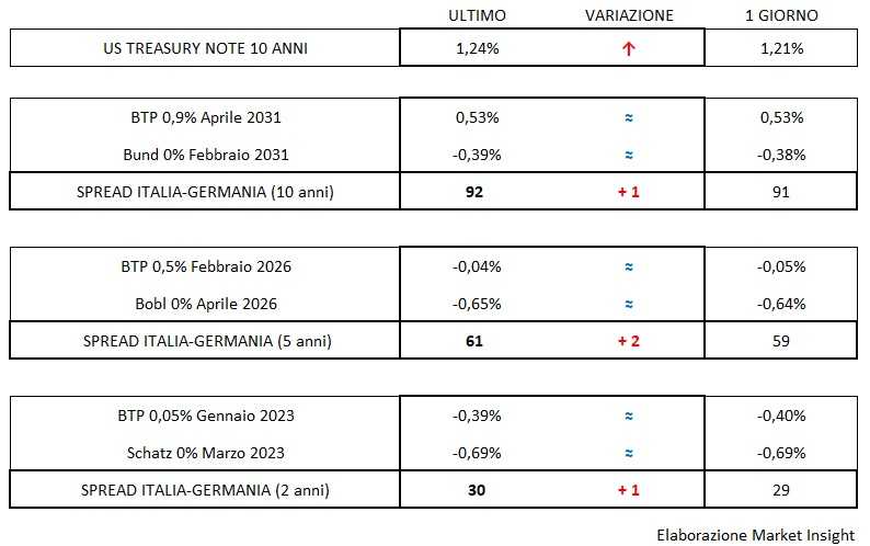 Nel frattempo il rendimento del Btp decennale è stabile allo 0,53% con uno spread a 92 punti (+1 bp).