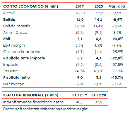 Dal lato patrimoniale, l’indebitamento finanziario netto è diminuito a 39,9 milioni dai 40,5 milioni al 31 dicembre 2019, dopo investimenti per 6,2 milioni principalmente effettuati dalla controllante per i macchinari per nuove linee produttive EOS, PPLF e “laminato in formato 142” e aver ottenuto nuovi finanziamenti garantiti per 10,9 milioni.