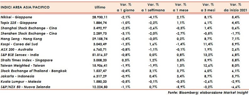 In Giappone, Nikkei e Topix segnano rispettivamente un -2,1% e -1%.