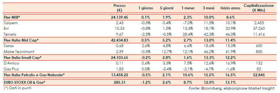 A Milano il Ftse Mib ha archiviato le contrattazioni con un +0,1% a 24.139 punti. Il Ftse Italia Petrolio e Gas Naturale ha segnato un -0,5%, rispetto al -1,2% del corrispondente indice europeo.