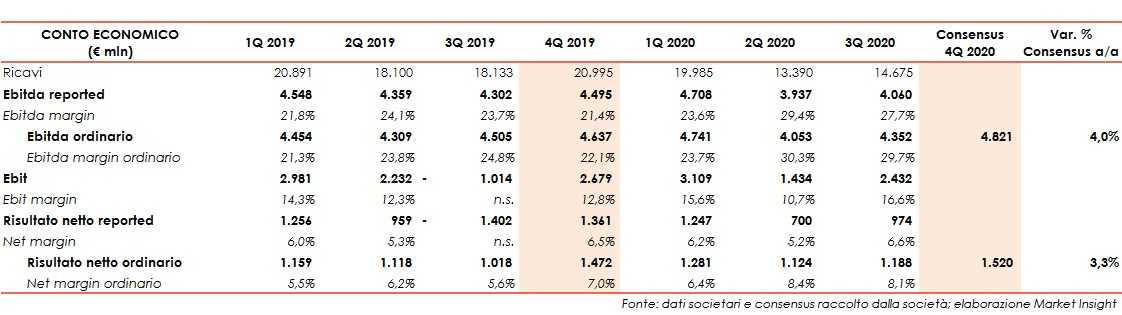 Nel dettaglio, sulla base delle stime degli analisti raccolte dalla società, l’Ebitda ordinario dovrebbe risultare pari a circa 17,97 miliardi mentre l’utile netto ordinario è stimato pari a 5,11 miliardi.