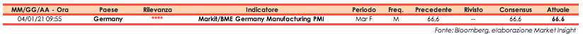 La lettura finale di marzo dell’indice Markit (PMI) manifatturiero della Germania si è attestata a 66,6 punti, confermando il consensus del mercato e il dato preliminare.