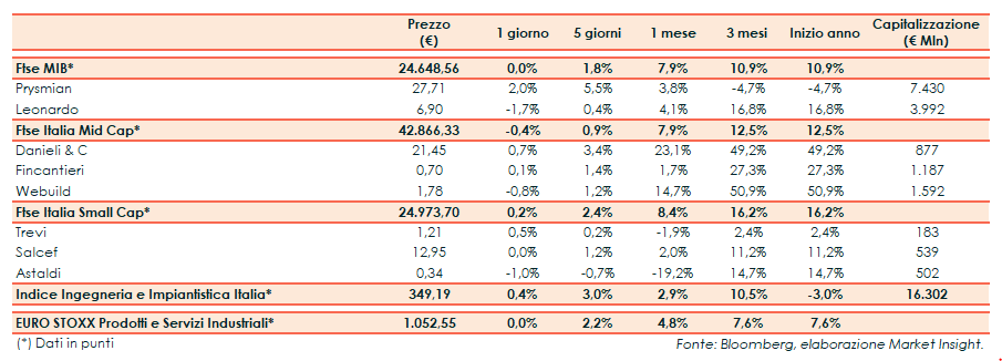 A Milano il Ftse Mib ha archiviato le contrattazioni stabile a 24.648 punti. L’indice Ingegneria e Impiantistica ha segnato un +0,4%, mentre il corrispondente indice europeo ha terminato invariato.