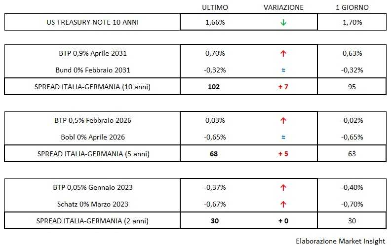 Oltreoceano il tasso del T-Bond si fissa all’1,66% (-4 bp), con il Segretario al Tesoro Janet Yellen che ha nuovamente escluso un’accelerazione dell’inflazione e dei tassi di interesse.