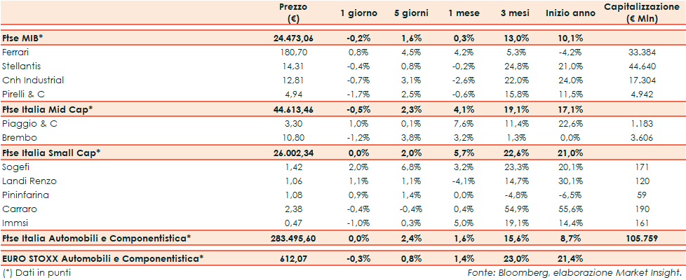 A Milano il Ftse Mib ha archiviato le contrattazioni con il -0,2% a 24.473,06 punti. Il Ftse Italia Automobili e Componentistica rimane invariato a fine seduta, rispetto al -0,3% del corrispondente indice europeo.