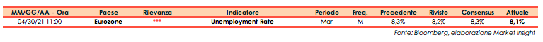 A marzo il tasso di disoccupazione dell’Eurozona si è attestato all’8,1%, al di sotto del dato di febbraio 8,2% (rivisto da 8,3%), consensus all’8,3%.