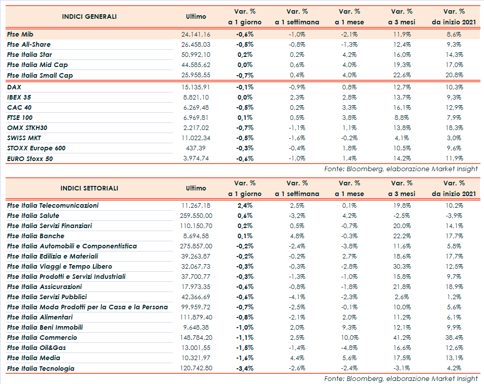 A Piazza Affari il Ftse Mib archivia gli scambi in calo dello 0,6% in area 24.141 punti. Debole anche il Cac 40 di Parigi (-0,5%), poco mossi il Dax di Francoforte (-0,1%), l’Ibex 35 di Madrid (flat) e il Ftse 100 di Londra (+0,1%).