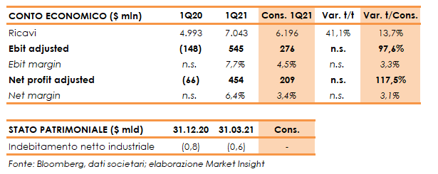 A livello di margini, l’Ebit adjusted delle attività industriali è risultato pari a 545 milioni (276 milioni il consensus) da una perdita operativa di 148 milioni nel primo trimestre 2020, con un’incidenza sul fatturato salita al 7,7%.