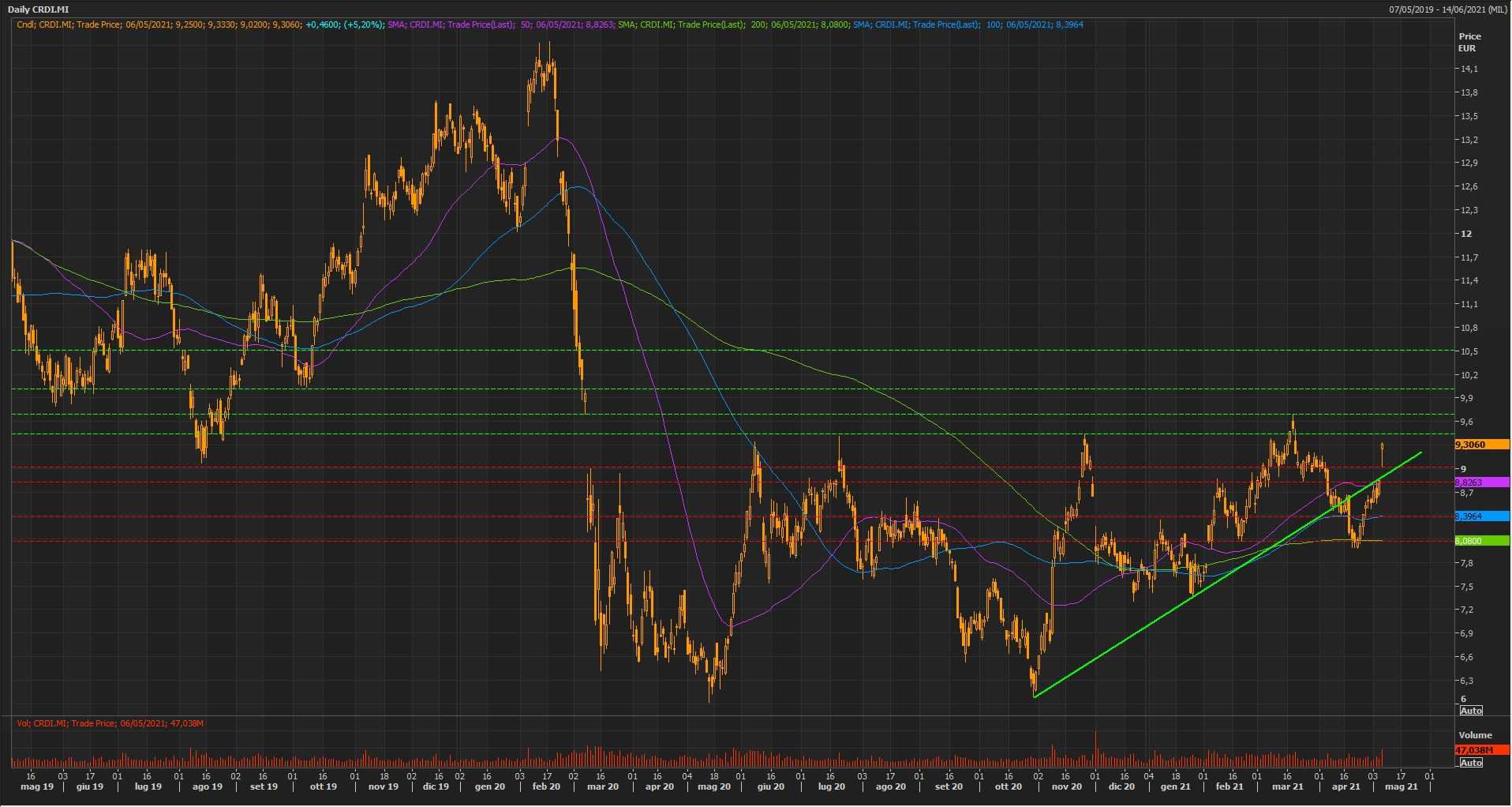 Il balzo di questa mattina, iniziato con un ampio gap up, ha impresso una decisa accelerazione al trend ascendente di breve periodo avviato il 23 aprile scorso dalle quotazioni dei titoli dell’istituto di credito milanese sulla tenuta del fondamentale supporto statico posizionato in area 8 euro. Il violento movimento odierno è stato innescato da risultati trimestrali superiori alle attese, accompagnati da un outlook positivo per la restante parte del 2021, e ha consentito ai corsi delle azioni UniCredit di ritornare al di sopra della media mobile a 50 sedute e della trendline avviata sul bottom del 29 ottobre a 6,089 euro, nell’ambito di un quadro grafico ancora sostanzialmente neutrale nel medio periodo.