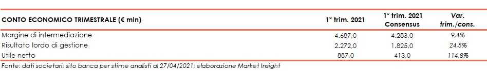 L’istituto di piazza Gae Aulenti ha registrato nel primo trimestre 2021 un margine di intermediazione pari a 4.687 milioni (4.283 milioni il consensus, +9,4%).