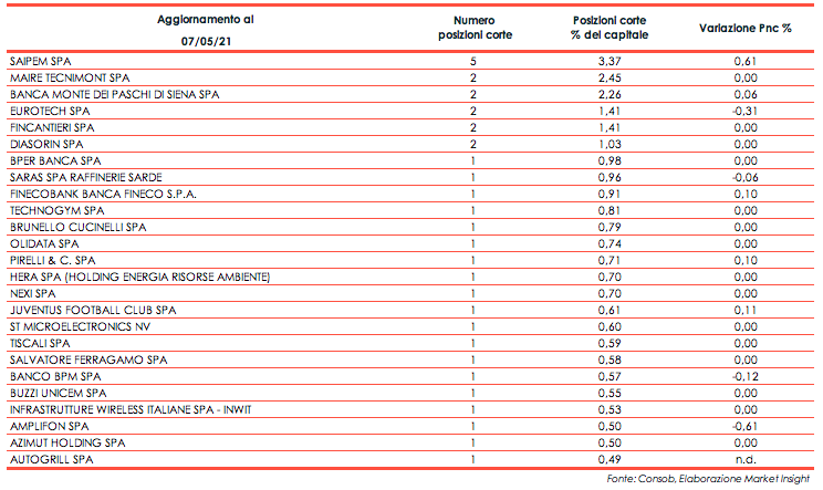 Oggi il titolo più shortato è Saipem con 5 posizioni nette corte per una quota pari al 3,37% del capitale (4 pnc, 2,76% al 30 aprile).