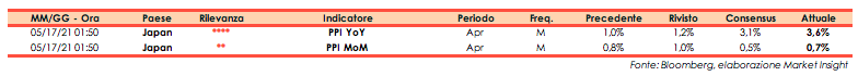 La Bank of Japan (BoJ) ha reso noto che nel mese di aprile i prezzi alla produzione (PPI) hanno registrato un aumento dello 0,7% su base mensile, (+0,5% consensus) dopo il +1% di marzo (rivisto da +0,8%).
