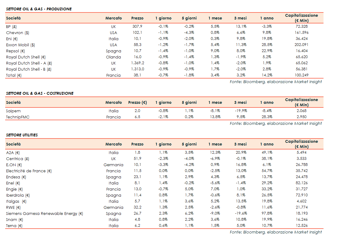 Si riporta l’andamento odierno dei principali titoli internazionali del settore energetico e delle utilities: