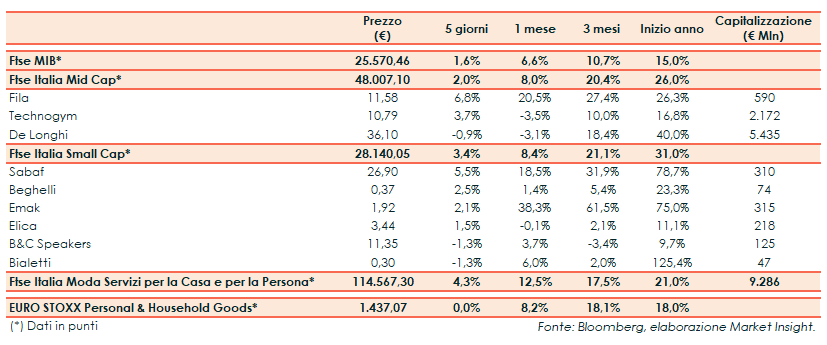 Il Ftse Italia Moda Servizi per la Casa e per la Persona ha segnato un +4,3% w/w, rispetto all’andamento piatto del corrispondente indice europeo. Nel settore dei beni per la casa in rialzo Fila (+6,8% w/w) e Technogym (+3,7% w/w), mentre ha chiuso la settimana in lieve ribasso De’Longhi (-0,9% w/w).