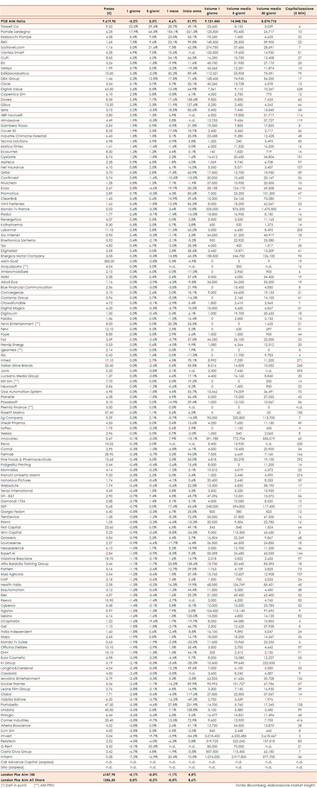 Il Ftse Aim Italia ha chiuso la seduta di ieri a -0,3% rispetto al -0,1% del London Ftse Aim 100 e allo 0,0% del London Ftse Aim All Share.