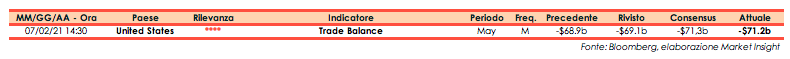 A maggio 2021 la bilancia commerciale degli Stati Uniti ha registrato un deficit di 71,2 miliardi di dollari, sostanzialmente in linea con le attese (-71,3 miliardi di dollari), dopo un disavanzo ad aprile di 69,1 miliardi (dato rivisto da -68,9 miliardi). Lo rende noto il Dipartimento del Commercio degli Stati Uniti.