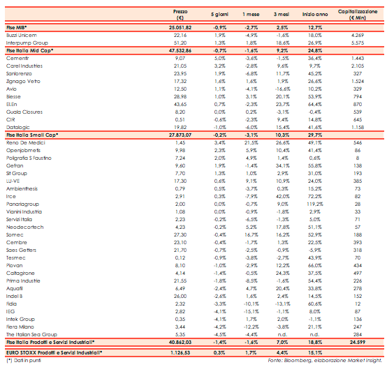 Nelle sedute dal 5 al 9 luglio il Ftse Mib ha perso nel complesso lo 0,9% a 25.051 punti, rispetto al -1,4% w/w del Ftse Italia Prodotti e Servizi Industriali ed al +0,3% w/w del corrispondente indice europeo.